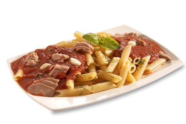 angebratene Schinkenwürfel und Knoblauch in Mama´s Tomatensosse mit einem Schuss sahnesosse