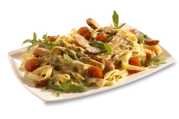 Hähnchenbrust, Pilze in Basilikum Sahnesauce mit Rucola und Cherrytomaten