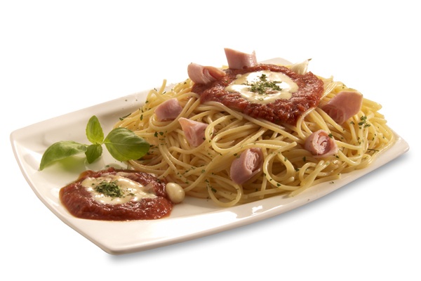 angebratene Schinkenwürfel und Knoblauch in Mama´s Tomatensosse mit einem Schuss sahnesosse